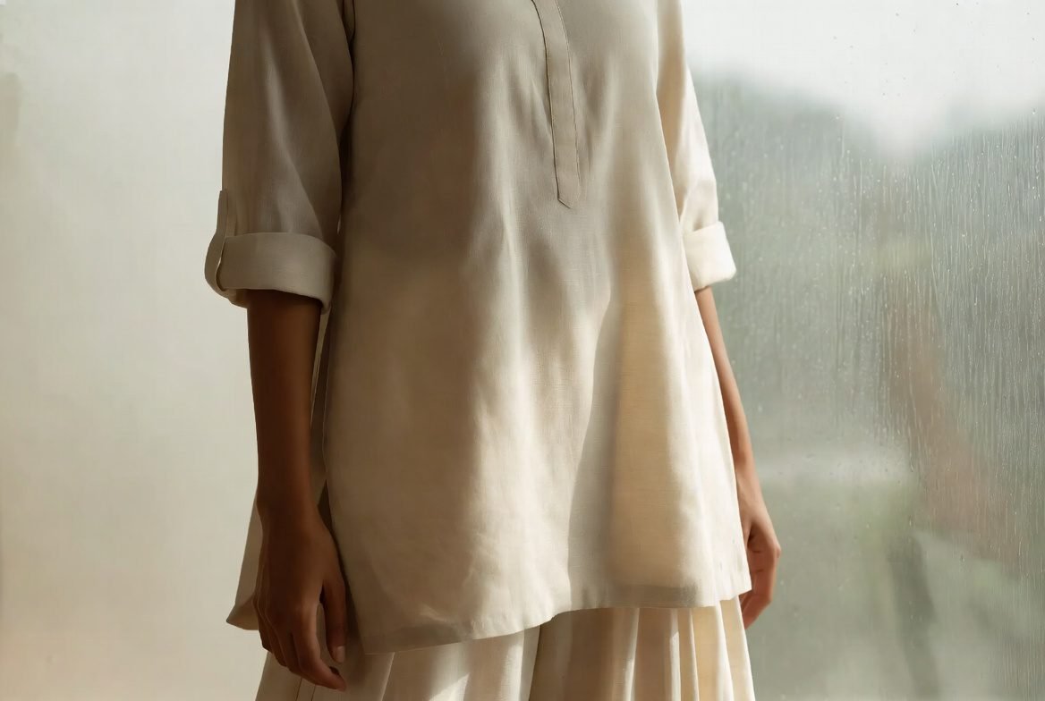 Cotton is your default. It dries fast, breathes well, and doesn’t cling to your body when wet the way synthetics do. Cotton-blend kurtas, cotton shirts, cotton palazzo pants. These should form the backbone of your July wardrobe.