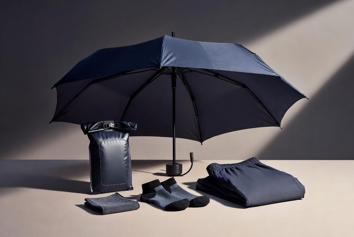 We’re putting together what we call the Monsoon Survival Kit. A small list of essentials: a compact umbrella, a waterproof pouch for your phone and wallet, a change of socks, a quick-dry towel, and one outfit backup at your workplace.